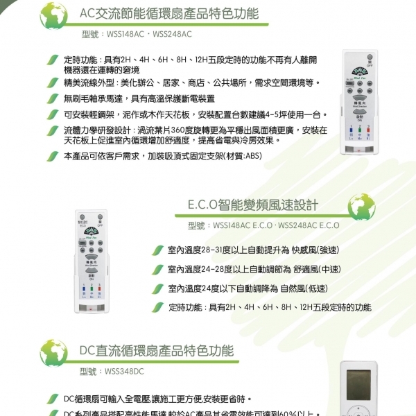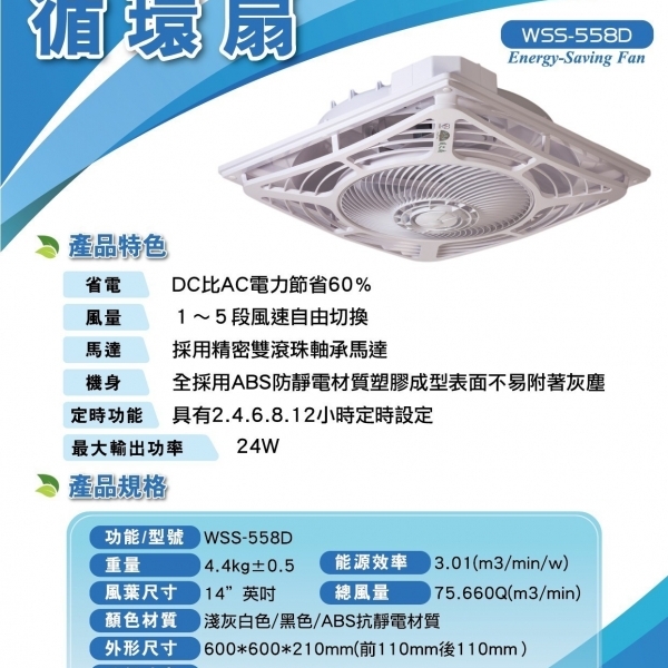 輕鋼架型DC直流變頻循環扇型號:WSS-558D,榮獲國家標準局專利,流體力學設計,可兼具美觀與半圓弧型風罩之空氣導流,斜向通風口設計,不突兀薄型式,提升對空氣導流之順暢,循環效率,低噪音功效。